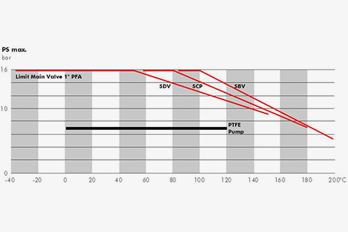 主阀标准1“- 150磅,PFA内衬,手动操作(可选的SDV隔膜阀,SCP圆柱形旋塞阀或SBV球阀)。